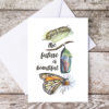 Original watercolor design shares the beautiful Monarch lifecycle from busy caterpillar to waiting chrysalis to glorious butterfly along with the inspiring phrase, "the future is beautiful"
